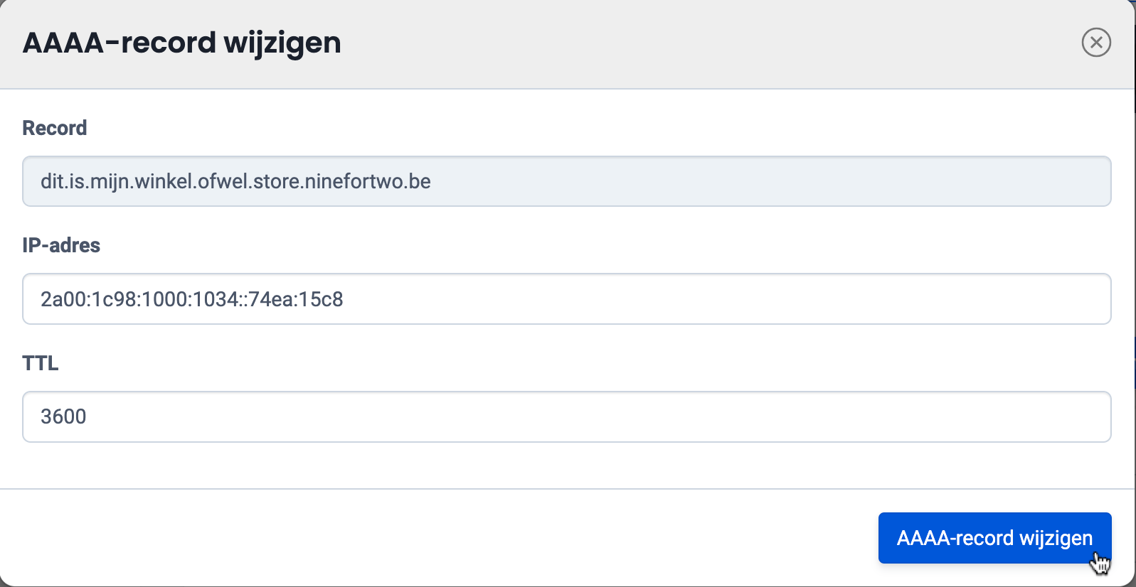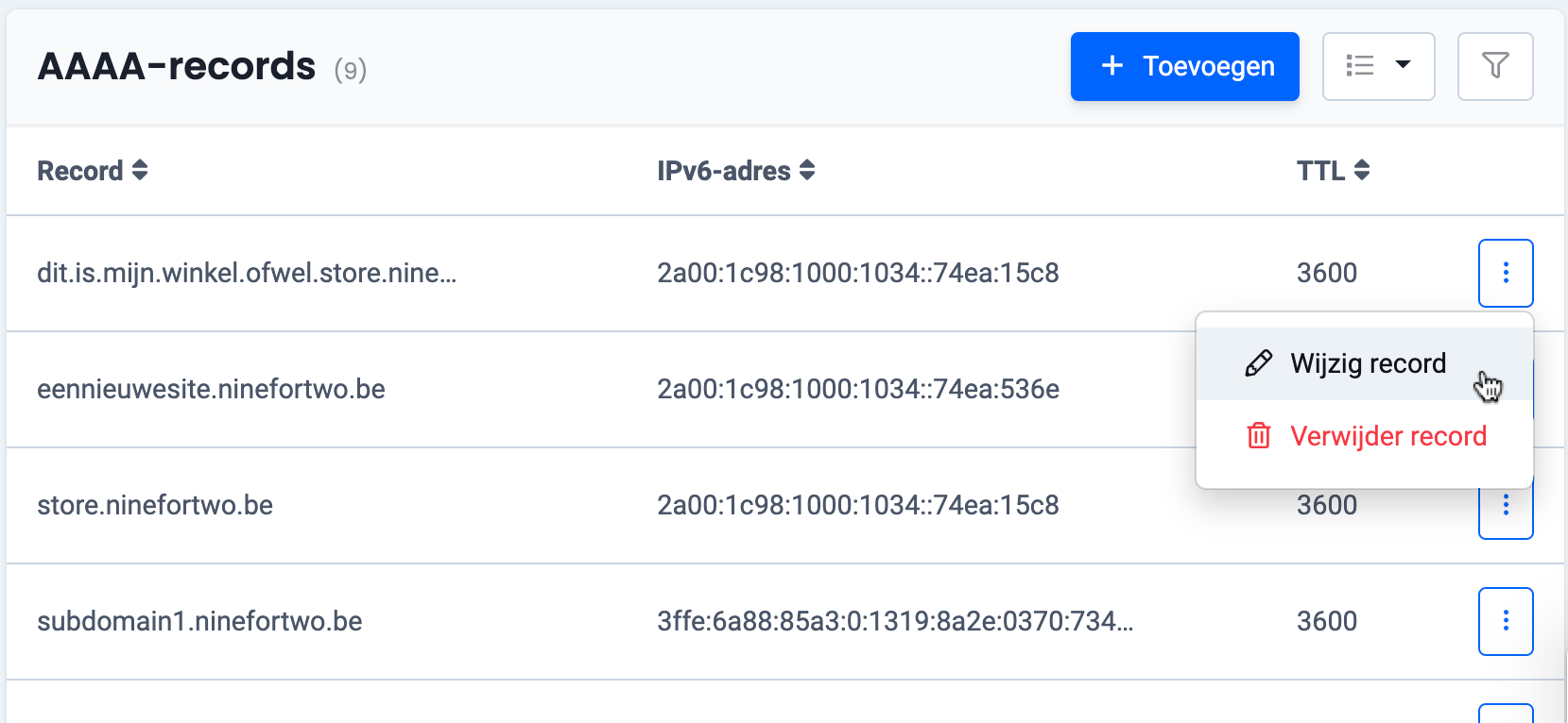 - Om een bestaand AAAA-record te wijzigen, kies de host die je wil wijzigen en klik op de 3 bolletjes rechts. Klik daarna op “Wijzig record”. Vul het nieuwe IP-adres in en klik op “AAAA-record wijzigen”.