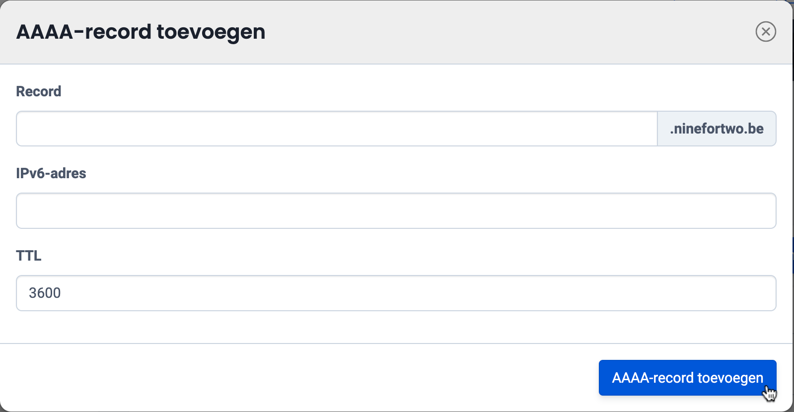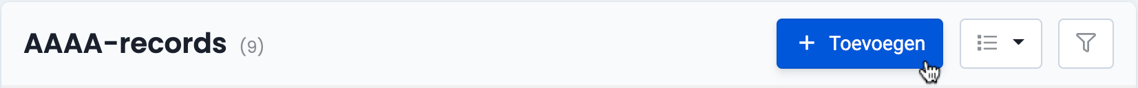 Om een nieuw AAAA-record toe te voegen, klik je bovenaan op “+ Toevoegen”. Geef een naam aan het subdomein of laat dit blanco als je het AAAA-record voor de domeinnaam zelf wil aanmaken. Vul het IP-adres in en klik op “AAAA-record toevoegen”